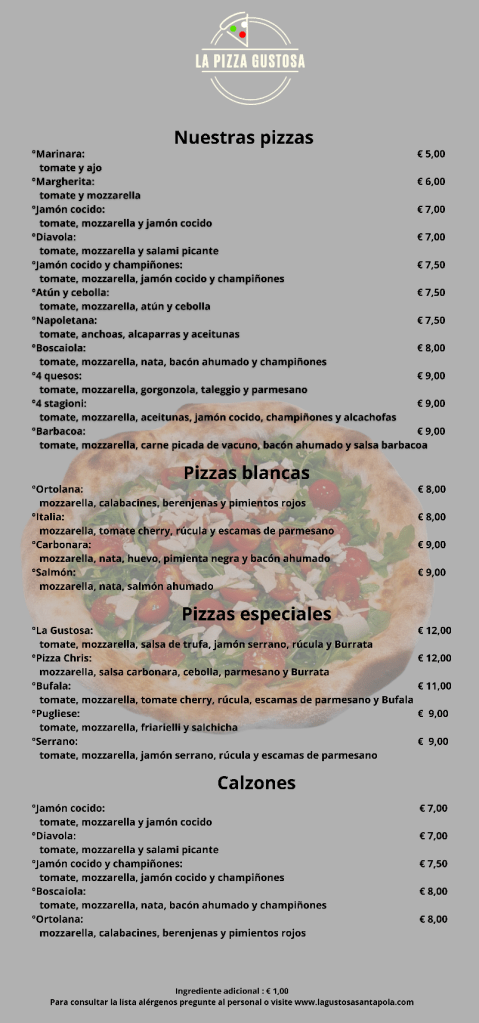 Todas nuestras pizzas Pizza boscaiola Pizza La Gustosa Pizza Bufala Pizza Ortolana Pizza Serrano Pizza Carbonara Pizza pugliese Pizza diavola Pizza atún y cebolla Pizza marinara Pizza Italia Pizza Jamón cocido Pizza 4 stagioni Pizza barbacoa Pizza jamón cocido y champiñones Pizza margherita Pizza Napoletana Pizza Chris Pizza Salmón